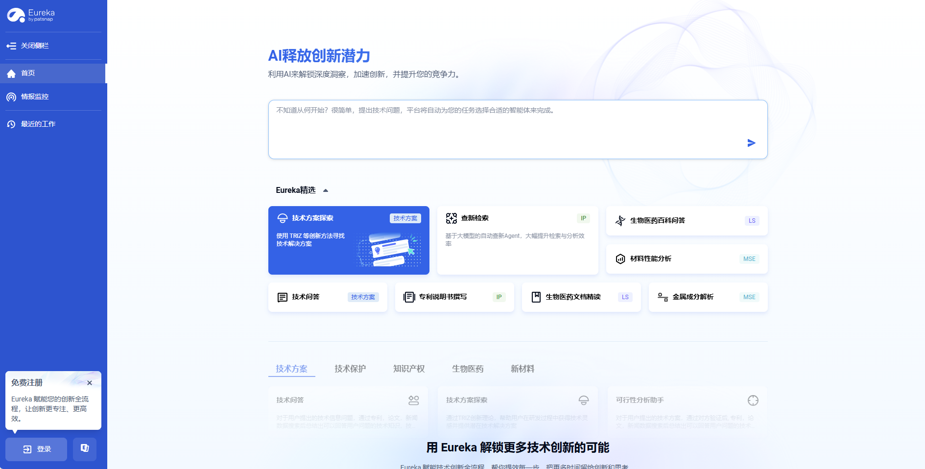 Eureka专注于知识产权、研发、生物医药、材料、科创等专业领域,提供一系列专家型AI智能体,首批上线近20个,包括查新检索、专利撰写、技术方案探索、技术问答、生物医药百科、材料性能分析等。这些AI Agent能够深入理解用户需求,结合业务场景自主拆解并完成复杂任务,可提升70%以上的工作效率。